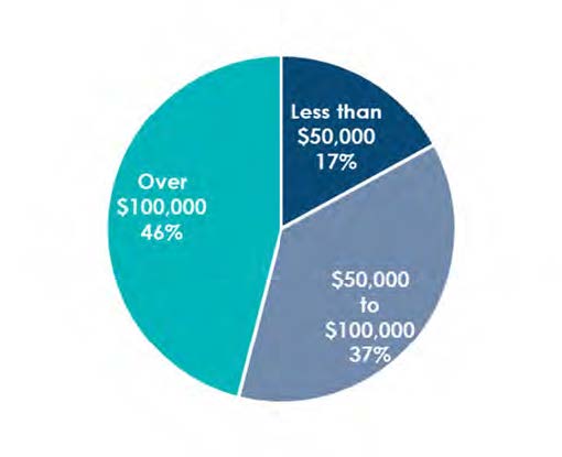 As noted in Chapter 2, Arlington has a unique demographic profile compared to the rest of Virginia. It has a faster-growing population, a lower median age, and a higher ratio of working- age residents. Arlington's population is approximately 60 percent white non-Hispanic/Latino, 17 percent Hispanic/Latino, 11 percent Asian non-Hispanic/Latino, and nine percent Black non-Hispanic/Latino (Figure 16). Seventeen percent of Arlington's full-time, year-round workers earn less than $50,000 a year, while 37 percent earn between $50,000 and $100,000, and 46 percent earn over $100,000 (Figure 17). Additionally, nearly 29 percent of Arlington residents speak a language other than English at home, while 30 percent speak English less than very well.46 A TDM equity analysis must consider where these socioeconomic groups live, work, and travel in Arlington County.