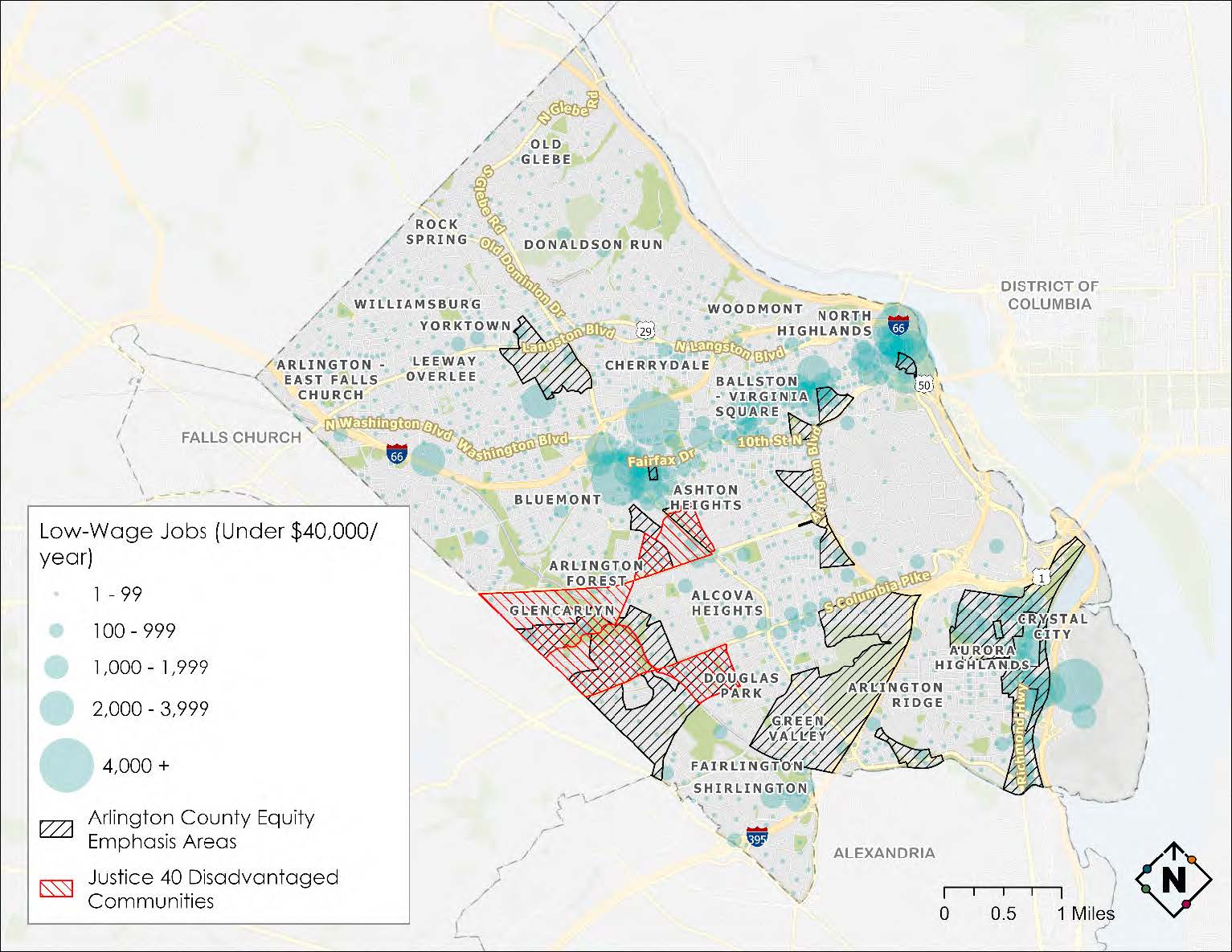 Figure 27 shows the geographic distribution of Arlington's low-wage jobs, defined as jobs paying under $40,000 per year. Low-wage jobs are mostly concentrated along the Rosslyn- Ballston corridor and Pentagon City and Crystal City, and to a smaller degree along Columbia Pike and Langston Boulevard, and in Shirlington. 63 Notably, there is little correlation between low-wage jobs and Equity Emphasis Areas, highlighting the need for reliable, affordable non- SOV travel options connecting workers from Arlington's Equity Emphasis areas—as well as workers from outside the County—to these areas with high concentrations of low-wage jobs.
